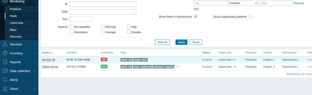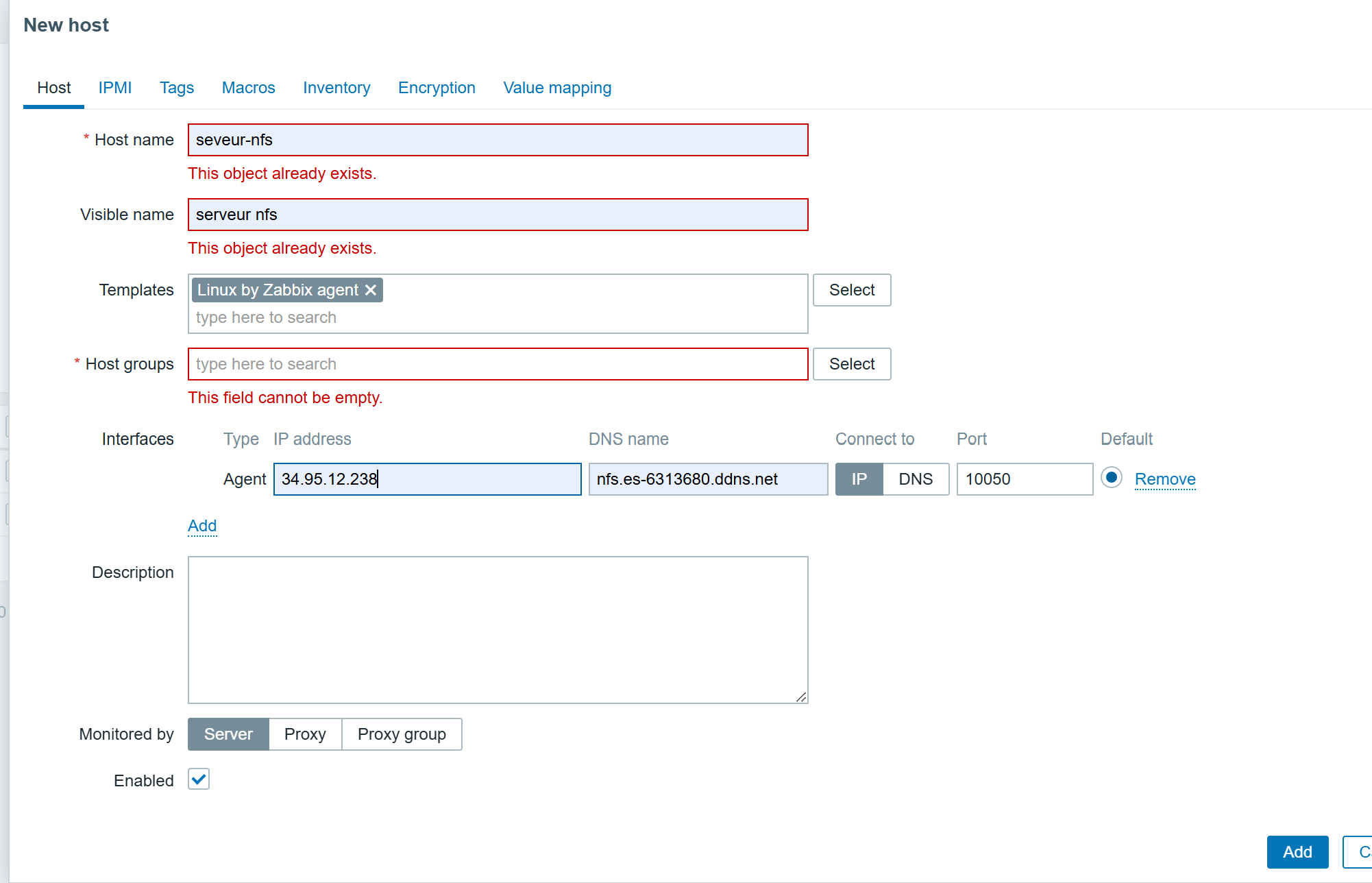 Sur serveur01 (si besoin) :sudo ufw allow 10051/tcp - Étape 4 — Ajouter le serveur NFS dans Zabbix Web